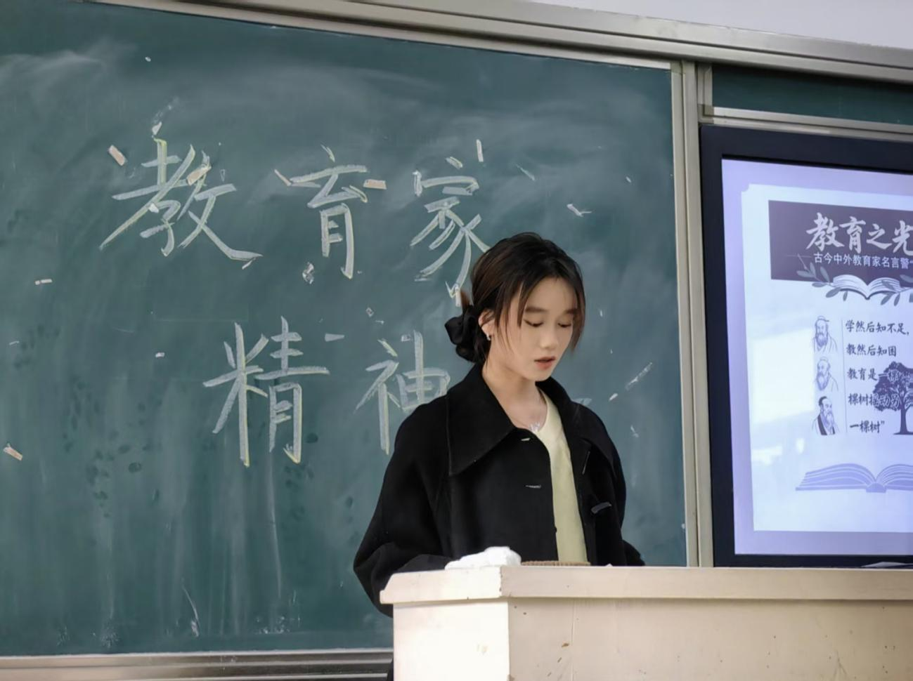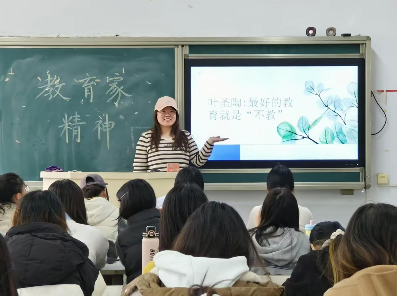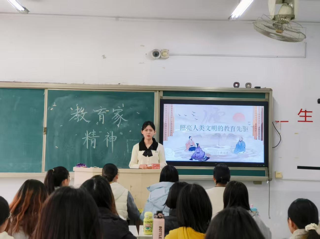 班会氛围升温阶段,杨懿丁配乐朗诵《师道长歌》,以深情演绎诠释教育家精神。此后,王奇玮、马晓玉分别分享苏格拉底与叶圣陶的教育故事:王奇玮详解“产婆术”启发式教学,并结合小学课堂实例说明实践方法;马晓玉围绕叶圣陶“生活即教育”“教是为了不教”理念,强调小学教育需贴近学生生活,主持人同步引导同学们结合专业展开讨论。